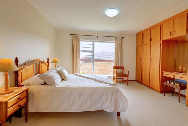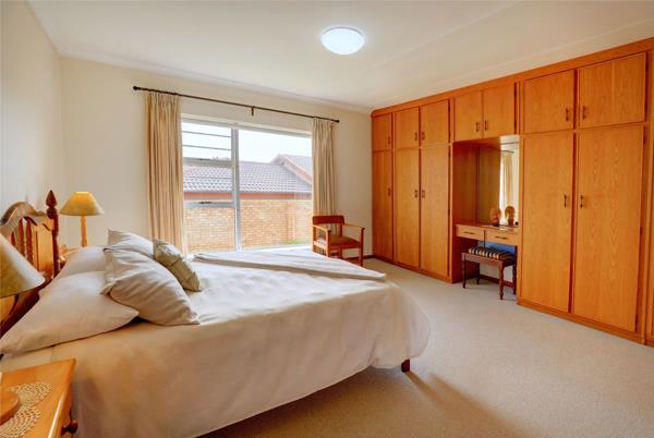 The open-plan kitchen includes a separate scullery and connects to a sheltered stoep, which provides access to the double garage, outdoor braai, and beautifully maintained garden with lush grass and thriving fruit trees.