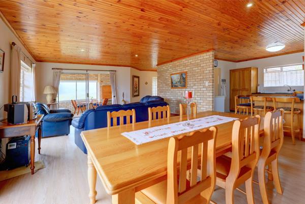 The warm tones of laminated flooring and wood ceilings enhance the sense of space, complementing the open-plan layout that integrates the living, dining, and kitchen areas. A fully enclosed indoor braai area opens effortlessly into the living space via sliding doors, creating the perfect setting for year-round entertainment.