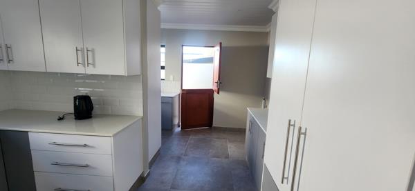 The home features three spacious bedrooms, each with built-in cupboards, and two beautifully finished bathrooms, including a main en-suite. The open-plan living and dining area is filled with natural light, creating a warm and inviting space for daily living and entertaining. The kitchen is fitted with modern finishes, including quartz countertops and a gas hob, offering both aesthetic appeal and practicality.