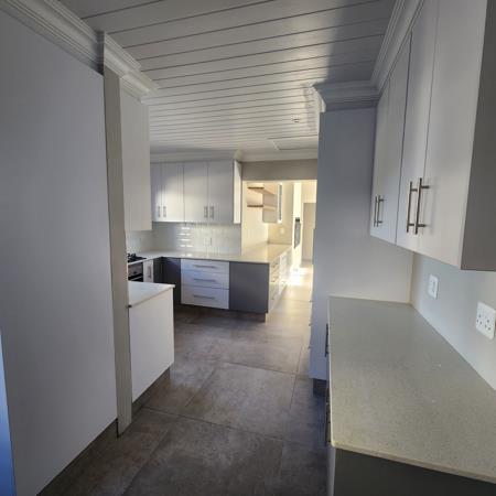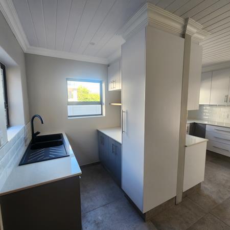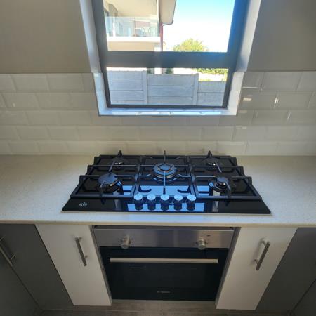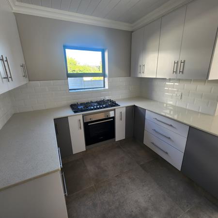 This thoughtfully designed home features three generously sized bedrooms, each fitted with built-in cupboards, and two sleek bathrooms, including a private en-suite off the main bedroom. The heart of the home is the open-plan kitchen, dining, and living area a bright, airy space ideal for both relaxed living and hosting guests. The kitchen is a true highlight, offering beautiful quartz countertops, ample storage, and a gas hob for efficient cooking.