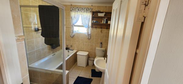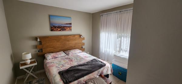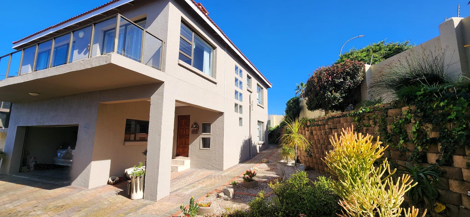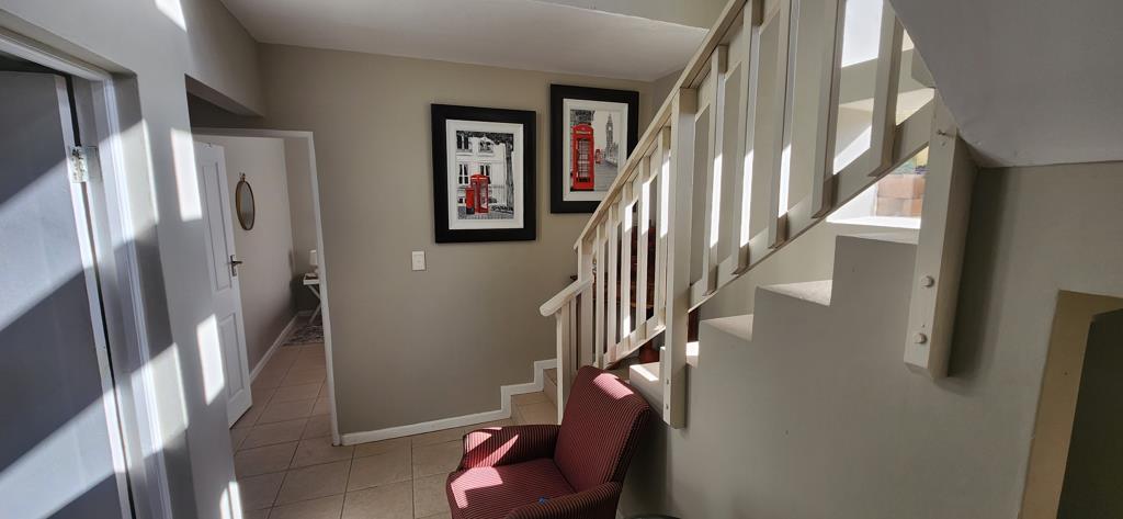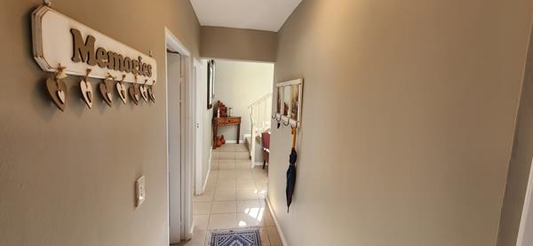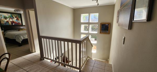 Upstairs, the open-plan living area flows seamlessly between the lounge, dining room, and kitchen. Just around the corner, an indoor braai area opens onto a balcony where you can soak in the breathtaking views. A guest toilet is also easily accessible on this level.