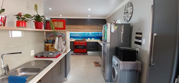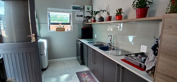 As you enter through the kitchen door you are greeted with modern finishes of cupboards and appliances. The kitchen have a unique backsplash behind the stove. The separate scullery have space for your washing machine, tumble dryer and dishwasher. There are ample cupboard and drawers to store all your appliances and keep the working surfaces clean and tidy.