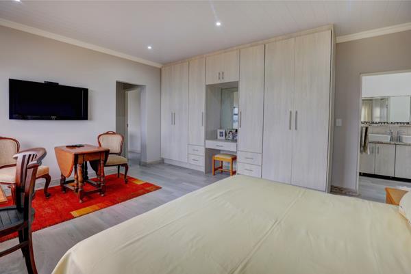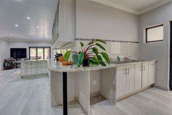 One of the standout features is the enclosed braai terrace, designed with stackable windows that open fully to create a seamless indoor-outdoor experience. The built-in, double-sided braai can be enjoyed from both the terrace and the dining room, making this the perfect all-weather entertainment space.