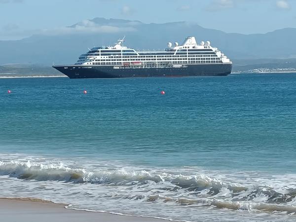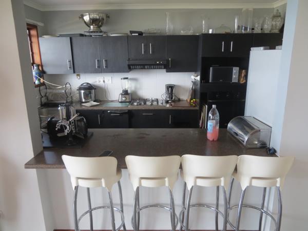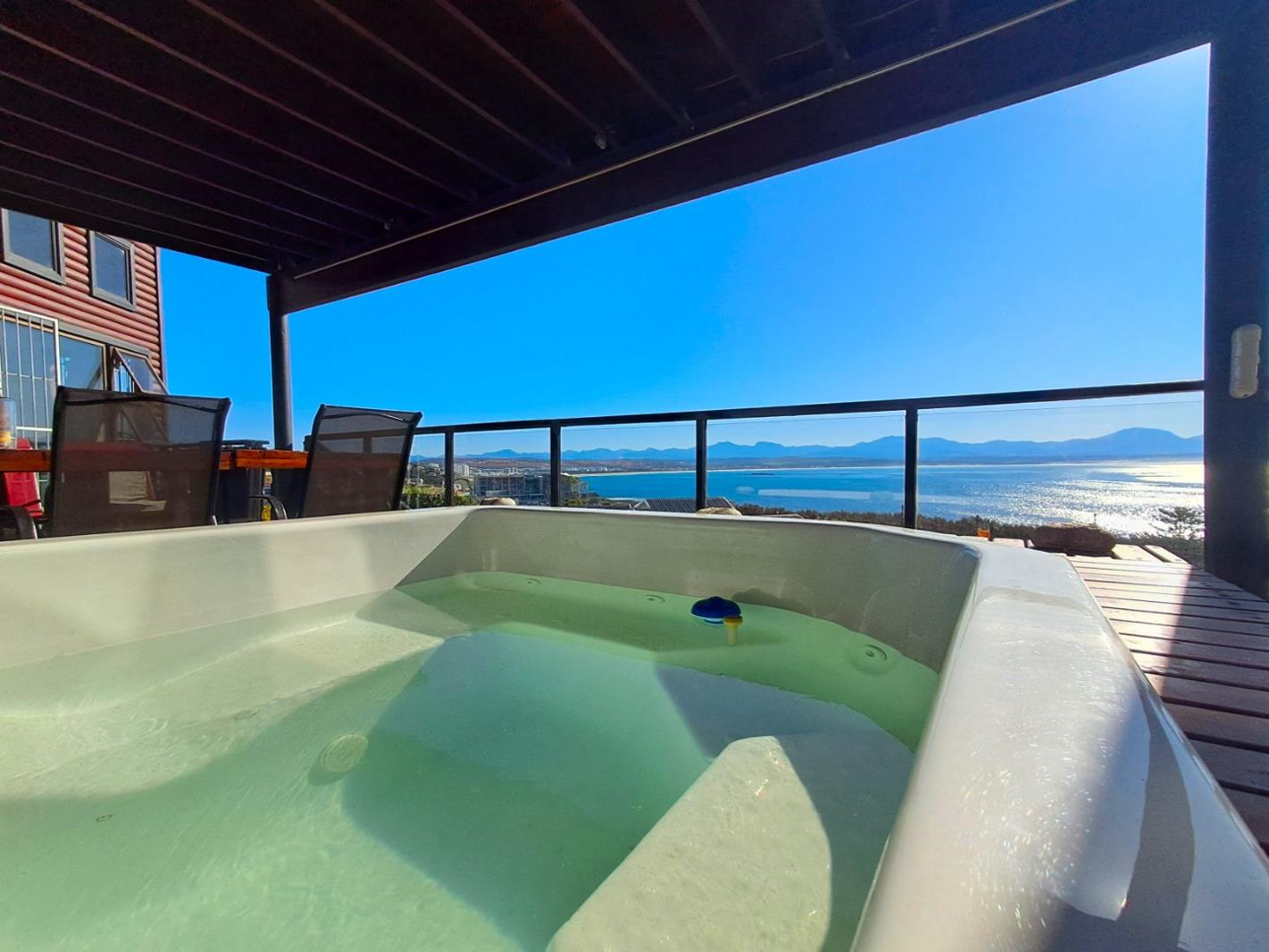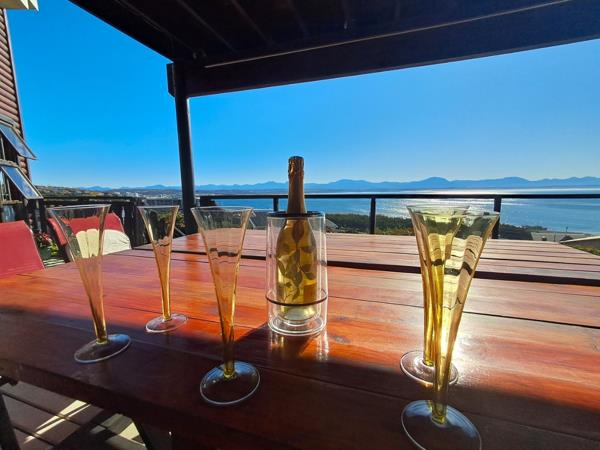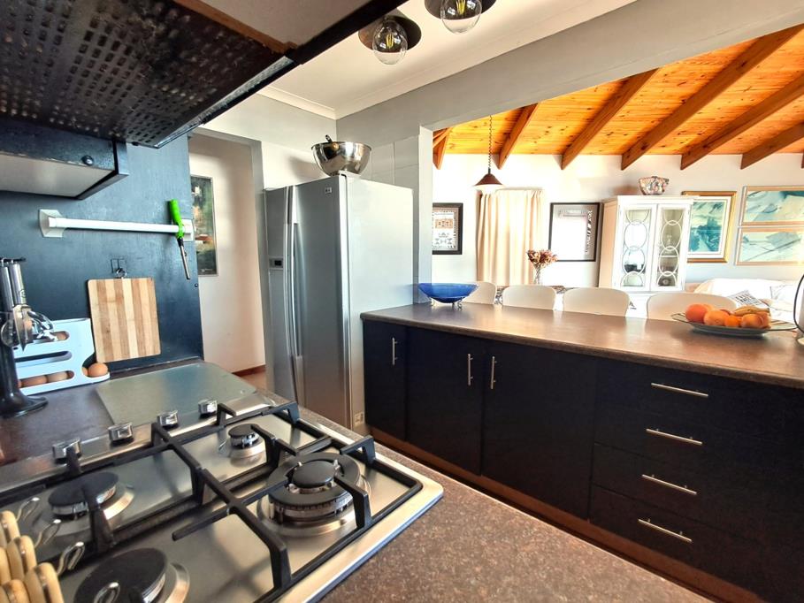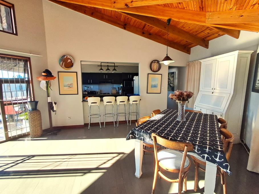 Wooden stairways lead to the master bedroom suite, boasting sleek en-suite bath, with a shower, generous closets and wonderful views of the Mossel Bay Bakke beach.