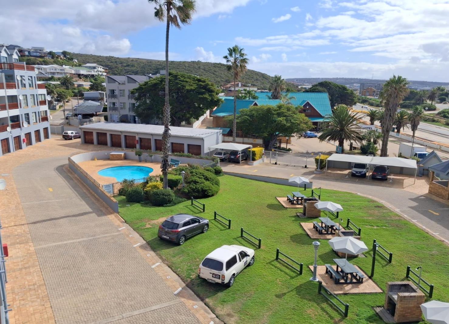 It overlooks the neat complex, the well kept garden, communal braai & swimming pool area.
