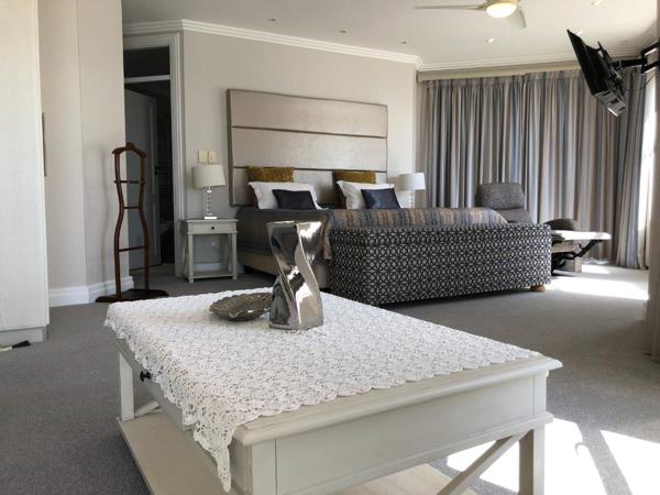 The main level features an open-plan kitchen, equipped with modern appliances and a separate scullery and walk-in pantry for added convenience. The main bedroom, located on this level, is a sanctuary of luxury with its expansive sea views and a large en-suite bathroom featuring his and hers basins, and heated elements for ultimate comfort.