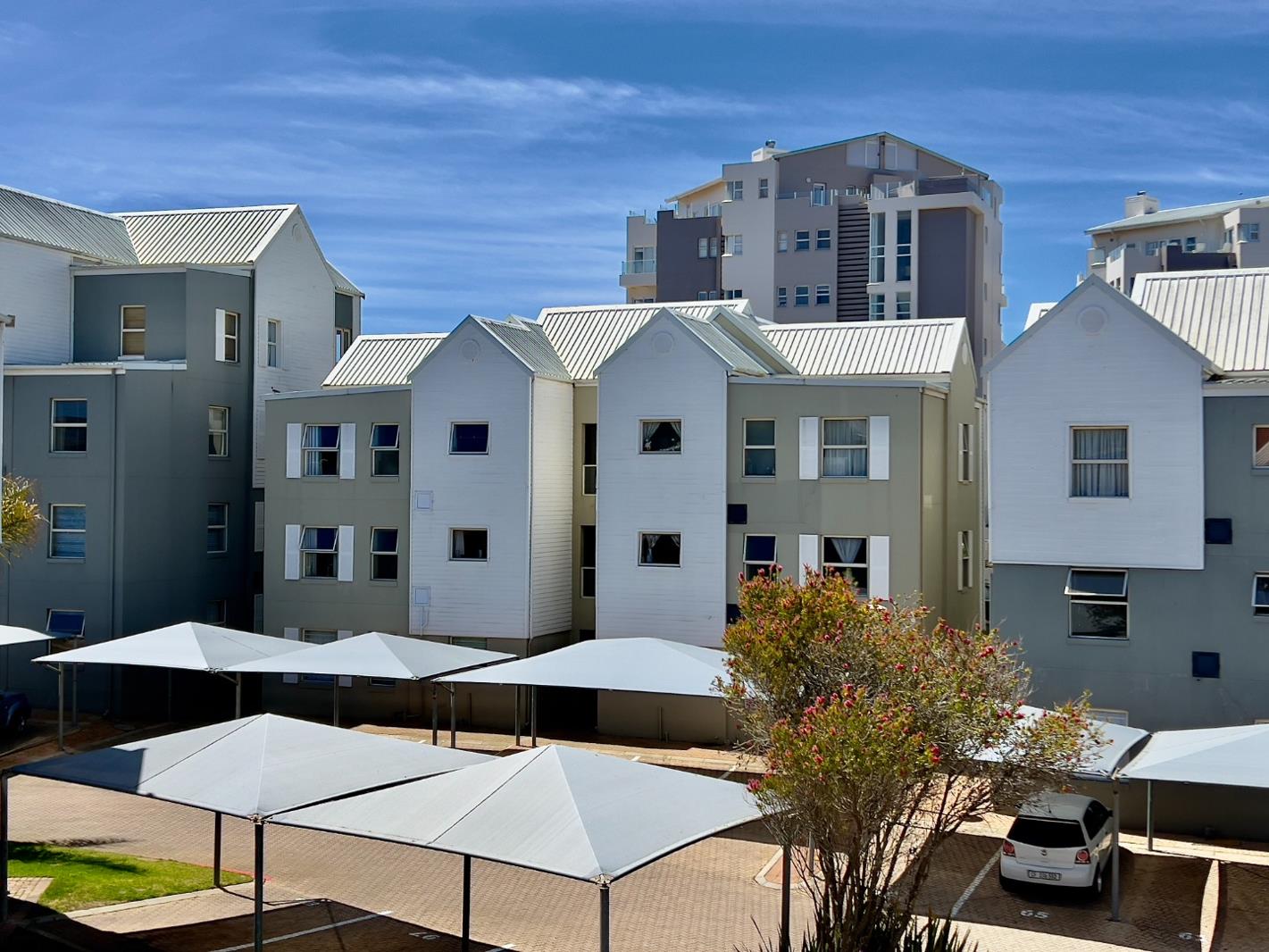 Begin your coastal lifestyle in this modern residential unit within the secure Estoril Villas complex, ideally situated in the vibrant suburb of Diaz Beach, Mossel Bay. The complex immediately impresses with its contemporary grey and white architectural facade, distinctive gabled roofs, and meticulously maintained landscaping featuring elegant palm trees. A robust, gated entrance, fortified with spiked strips and clear signage, ensures a secure and welcoming environment for all residents and visitors. Convenient covered parking facilities are available, enhancing the practicality and appeal of this well-designed development.