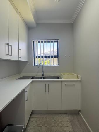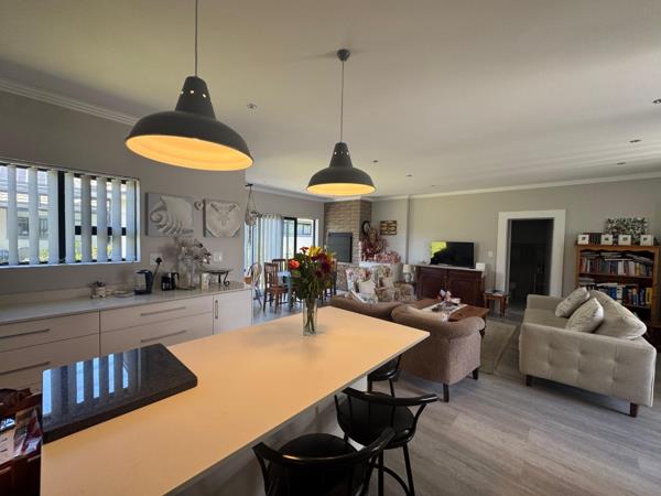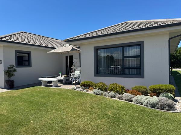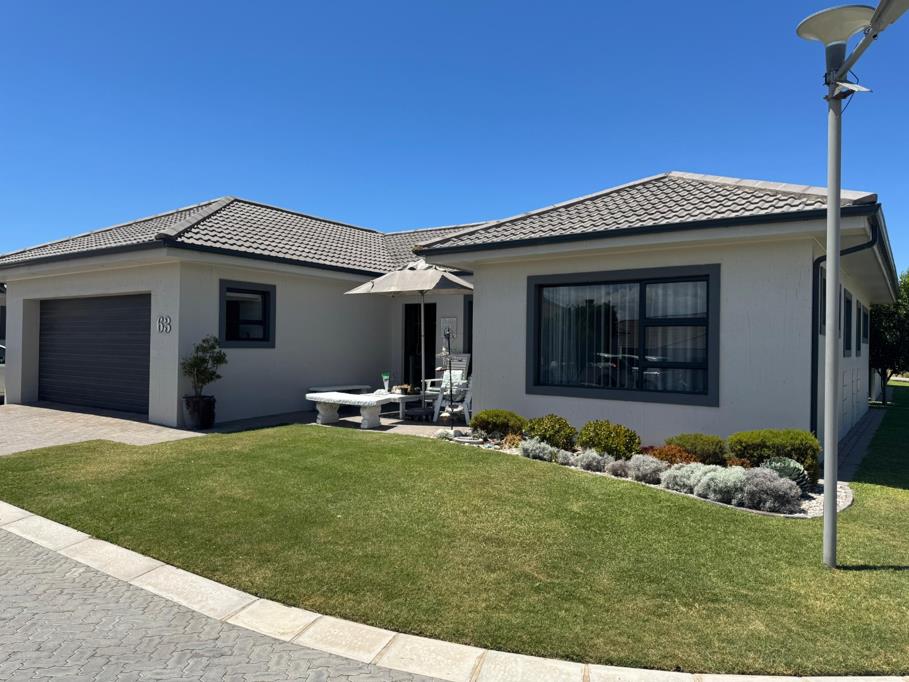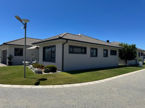Discover modern coastal living in this charming single-story home, perfectly situated within a sought-after retirement village in Diaz Beach, Mossel Bay. The property boasts excellent kerb appeal with its contemporary light-colored facade, dark tiled roof, and neatly manicured lawn. A paved driveway leads to a double garage, complementing the inviting front patio, ideal for enjoying the serene surroundings.