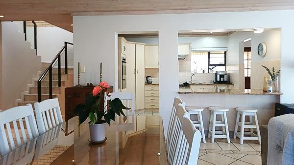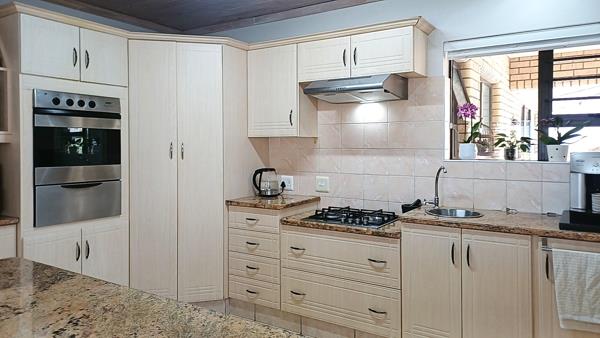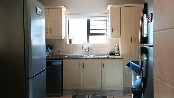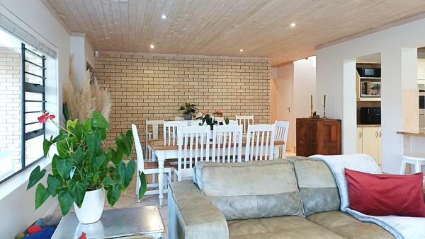 Upon entering, you are welcomed by a light-filled open-plan living, dining, and kitchen area, complemented by a separate scullery. The back door flows to a covered patio with a built-in braai, accessible from both sides, creating the perfect space for year-round entertaining. A cosy back garden adds charm and privacy.