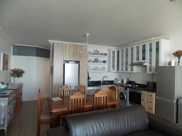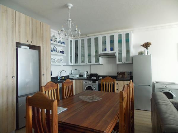 Up-market seaside apartment with a glass-enclosed balcony that allows in the sun, keeps out the wind and offers an awesome view of the crystal blue bay and the mountains in the distance. The apartment has an open plan living area and modern kitchen, 2 en-suite bedrooms and includes safe basement parking. The unit has laminated flooring and is available with the furniture included.
