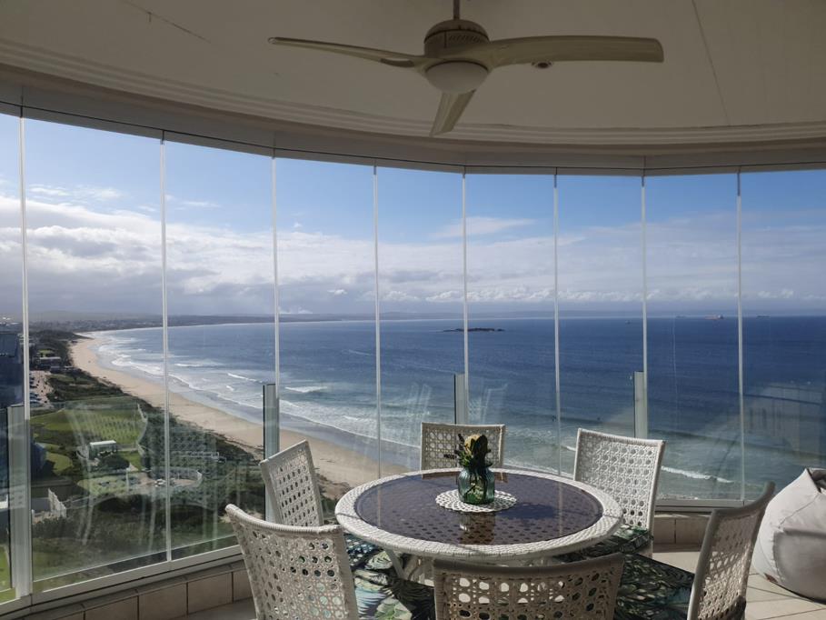 This spacious penthouse epitomises the ultimate luxury in seaside living. The apartment is spread over 2 levels with living areas, kitchen, enclosed balcony, en- suite bedroom and guest toilet on the lower level. This level is accessed by a private lift. Upstairs is a pajama lounge with kitchenette and 2 more en-suite bedrooms. Large open balconies on both levels provide breathtaking views. The unit includes a lock-up garage, a secure parking bay and a small storeroom.
