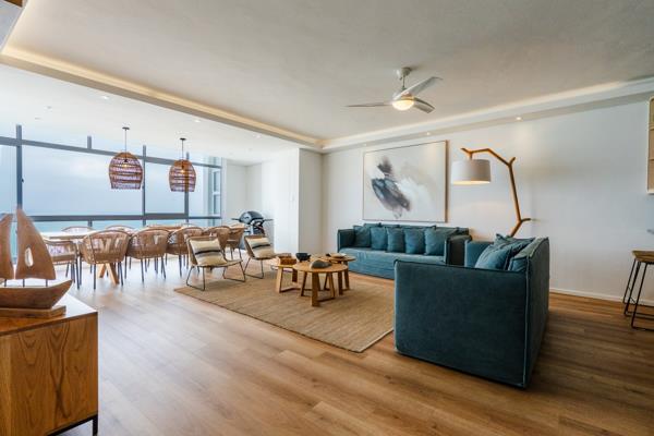Up-style beachfront apartment overlooking the entire bay and the mountains in the background. The apartment has a spacious and light-filled open plan living area, supplemented by a large enclosed balcony area, a modern kitchen with a practical breakfast table and space for appliances, 3 bedrooms, 2 bathrooms, a lock-up garage and a safe basement parking bay.