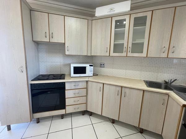 The apartment features a neat, serviceable kitchen complete with ample cupboard space.