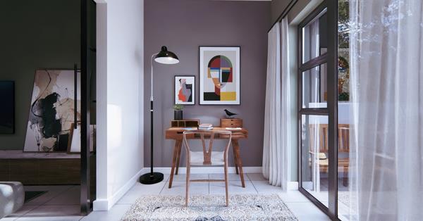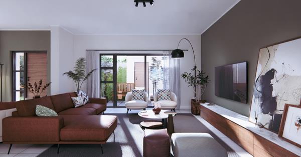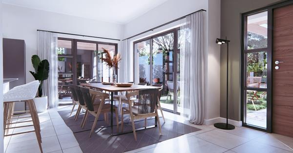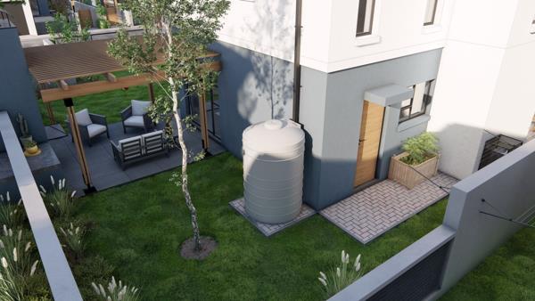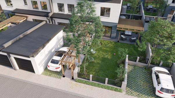 Featured here is a 169m² double storey townhouse with 3 bedrooms and 2 bathrooms m.e.s. on the upper level. On ground level is an open plan living and dining area, a kitchen, a study, a guest toilet, a patio, a single garage and a parking bay. Optional extras include any of the following: 2nd garage, undercover braai patio, entrance pergola or a PV system.