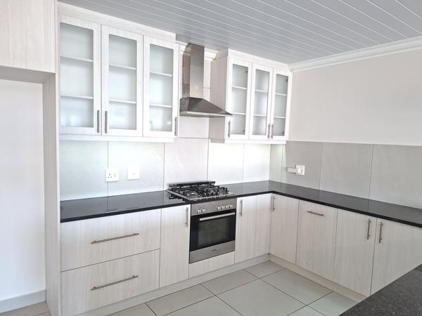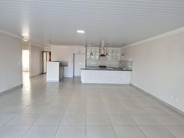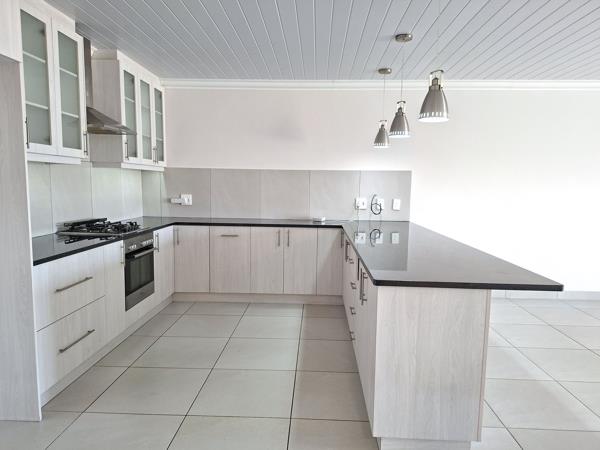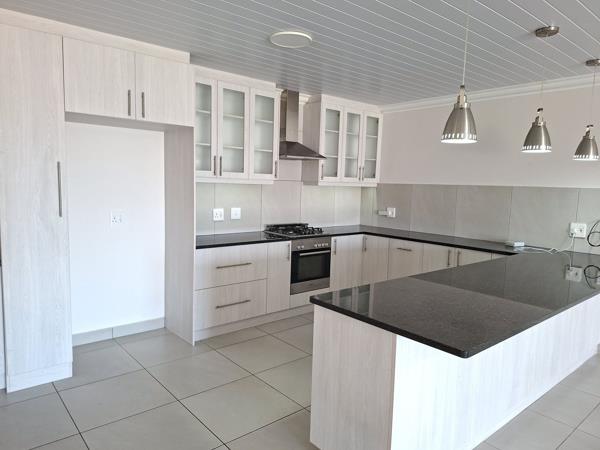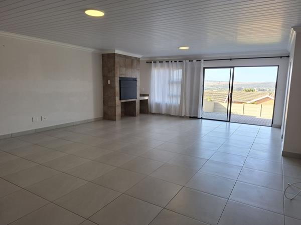 The heart of the home is a spacious, open-plan living and dining area, designed for both relaxation and social gatherings. A built-in braai enhances the entertaining experience, while large sliding doors provide access to a sunlit patio with scenic views.