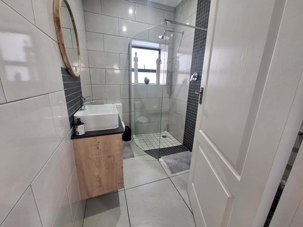 High vaulted ceilings, lovely dark exposed beams and a light bright interior with large windows. The indoor stainless-steel braai and entertainment area is the heart of this home with its large stackable doors opening up onto the lush garden. The kitchen has ample cupboard space, grey quartz tops, a gas hob and separate scullery with direct access into the garage. 3 Good size bedrooms of which the primary bedroom has an ensuite bathroom with double vanity, spacious walk-in shower, with stunning tile detail.