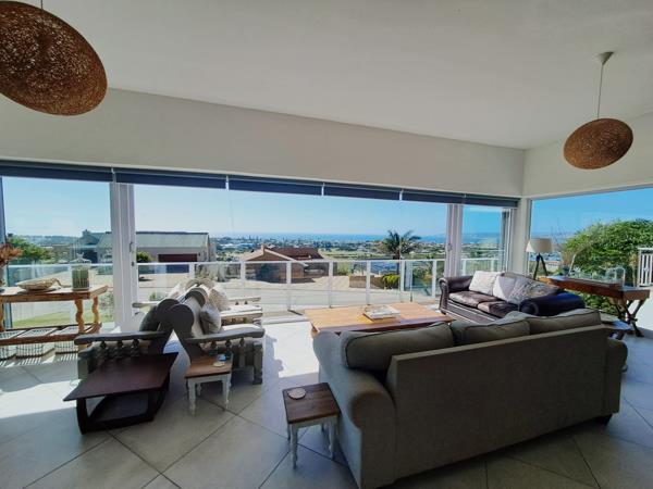 The home features an airy, open-plan layout with a well-equipped kitchen, dining area, and multiple living spaces. Large windows flood the rooms with natural light and showcase breathtaking views over the distant ocean towards Mossel Bay and the majestic Outeniqua Mountains.