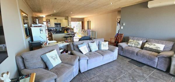 The heart of the home is the open-plan living and dining area, where natural light pours in through large glass doors, framing the expansive sea views. The sleek, well-appointed kitchen features ample storage and a separate scullery, flowing effortlessly into the living space and out onto a spacious balcony with built-in braai ideal for entertaining or simply soaking up the coastal atmosphere.