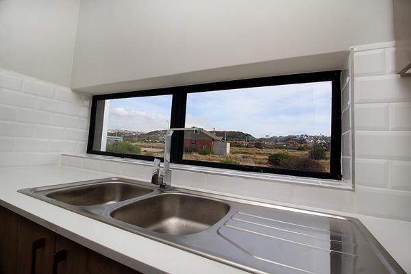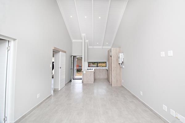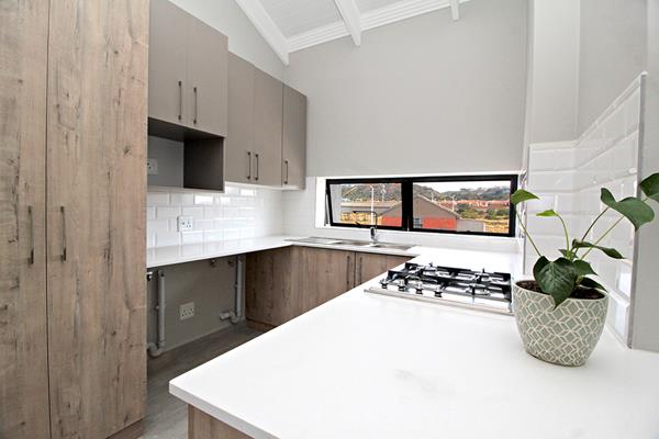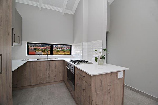 The open-plan living area flows seamlessly into a covered balcony with a built-in stainless steel braai perfect for year-round entertaining. The kitchen is fitted with a gas hob, ensuring both practicality and efficiency.