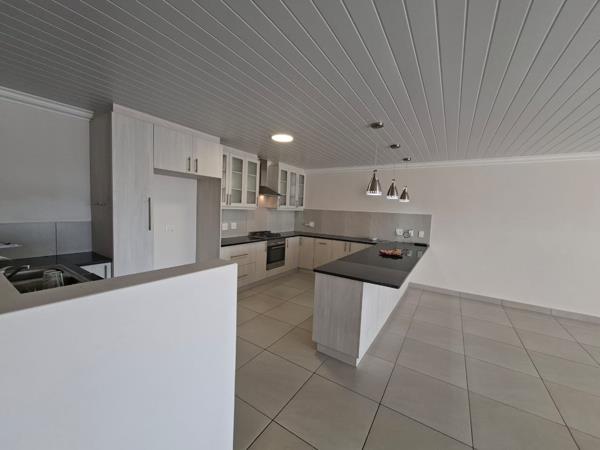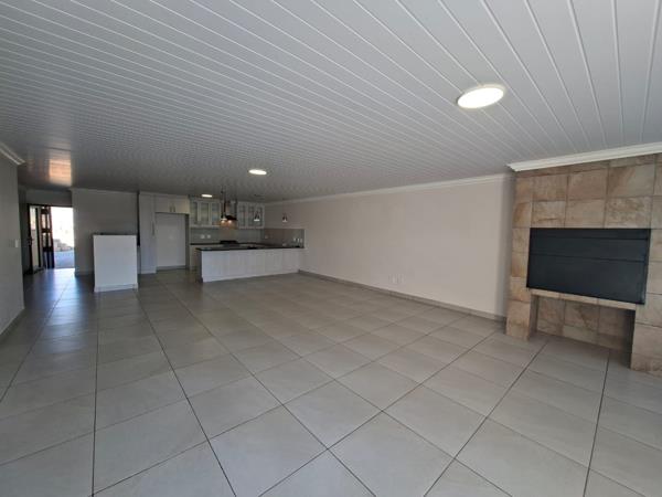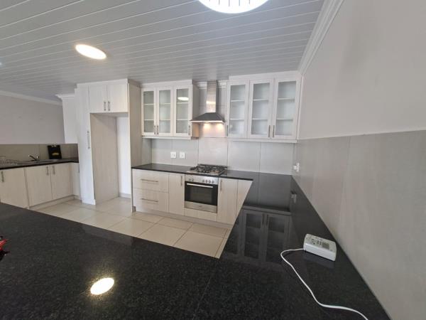 The generous open-plan living area, complete with a built-in braai, flows seamlessly into a modern kitchen fitted with sleek cabinetry, a gas hob, and an extractor fan the perfect space for both entertaining and everyday living.