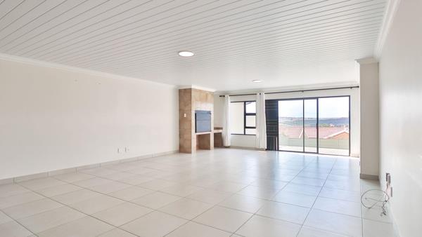 The home is elegantly tiled throughout, enhancing its sleek and modern ambiance. The expansive open-plan lounge and dining area offer a seamless flow, highlighted by a built-in braai that sets the stage for entertaining guests. Large sliding doors lead to a sunlit patio, providing breathtaking scenic views and an ideal spot for relaxation.