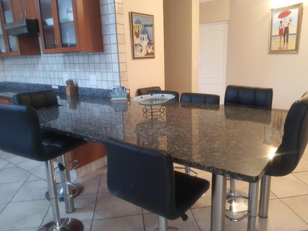 The modern kitchen is well planned with a fixed granite kitchen table. Extras include a pantry, a separate laundry for convenience, 2 storerooms, an outside shower and a built-in safe.