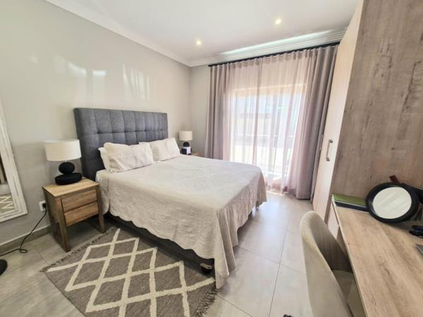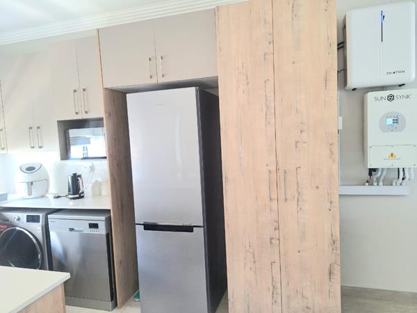 Light and modern apartment with an open plan living area and kitchen, 2 bedrooms and 2 bathrooms. Upmarket and up-to-date finishes and fixtures include a Smeg stove with gas hob in the open plan kitchen and a S/S braai in the living area, as well as a gas geyser and 4 sun panels plus a 3kva inverter.