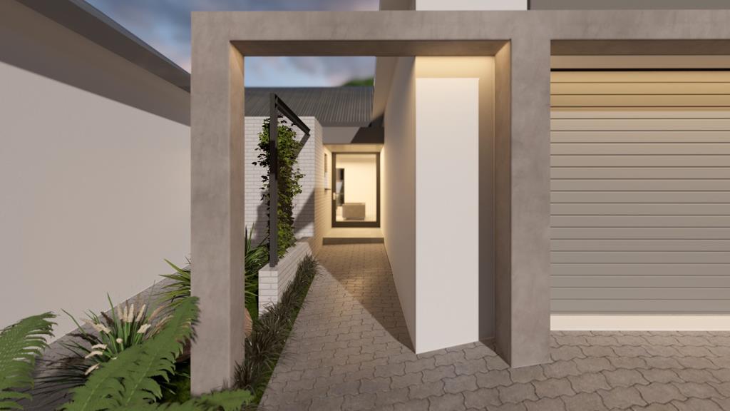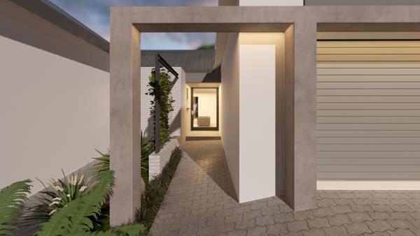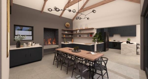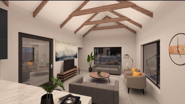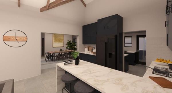 Practical design that includes a living area, open plan kitchen with separate scullery and braairoom. Spacious rooms are furhter enhanced by high ceilings. The main en suite is privately situated in one wing, with the 2 other bedrooms and shared bathroom are situated in the opposite wing. A large open patio is accessible from both the living area and the braai room. The double garage has direct access to the house.