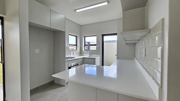 The kitchen boasts beautifully engineered quartz countertops a gas hob and ample cupboard space.