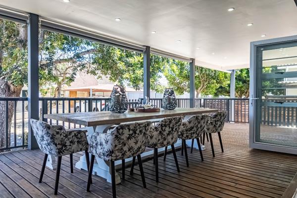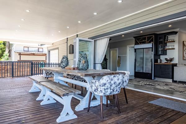 Embrace the quintessential South African lifestyle with exceptional outdoor amenities. A spacious covered deck and patio, complete with a built-in braai and a sophisticated built-in bar, create an idyllic setting for al fresco dining and entertaining. The upper balcony offers serene views, while the integrated double tandem garage provides secure and convenient parking. Pets are welcome, adding to the home''s inclusive appeal.