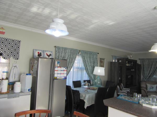The open-plan lounge and dining area feature laminated floors, leading to a family room with tiled floors and a sliding door to the entertainment patio, pool, and well-kept garden. The large, tiled kitchen includes a 5-plate gas stove, eye-level oven, extractor fan, and a scullery with appliance space. A separate laundry room is accessible from the kitchen.