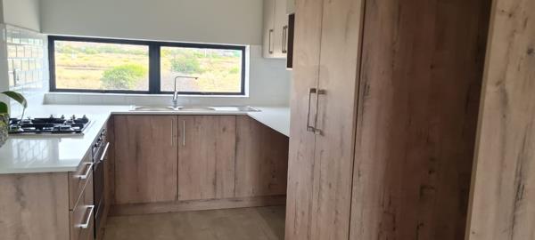 The heart of the home is a contemporary kitchen, boasting stylish wooden cabinetry, sleek countertops, and quality finishes. Its open layout flows effortlessly into the spacious lounge, where a built-in stainless-steel braai sets the scene for relaxed entertaining all year round.