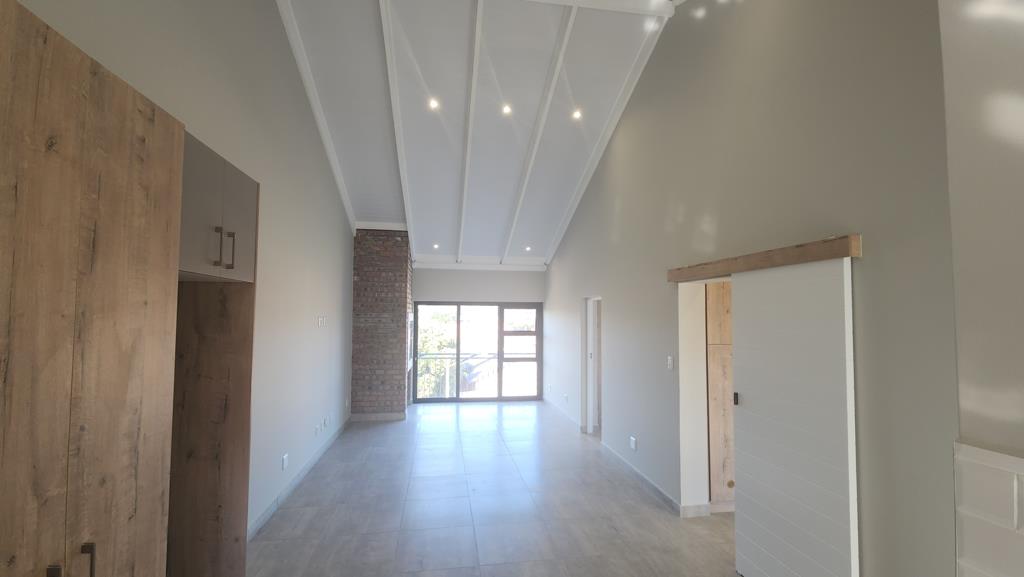 The open-plan living area flows seamlessly and includes a built-in stainless steel indoor braai for year-round entertaining. The modern kitchen is fitted with Smeg gas plates, an electric oven, and a gas geyser, ensuring convenience and energy efficiency.