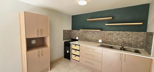 On the ground floor one enters through a sliding door into a sunny open plan living area and kitchen. The neat kitchen features a counter with Ceasar Stone top, racks on the wall, cupboards, drawers and 2 basins. There is a Defy 4 plate hob and oven for cooking requirements. One bedroom with built-in cupboards is also on this level offering a large bathroom with bath, basin and toilet.