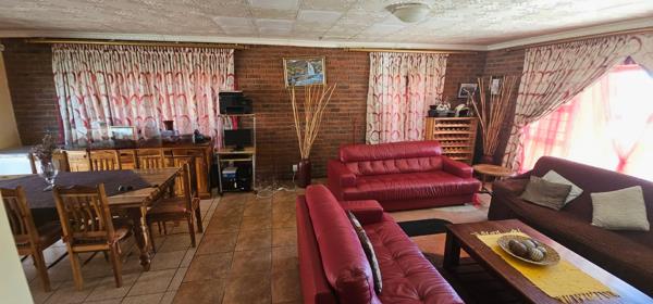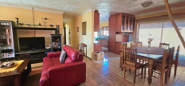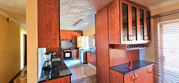 The large open plan kitchen has beautiful tiled floors and is thoughtfully designed with practicality in mind, equipped with a hob, under-counter oven and convenient space for a washing machine, niche for a double fridge, lots of cupboards, and a corner pantry cupboard, ensuring that everyday chores are manageable. The layout of the home includes a wide passage that connects the living areas to the three spacious bedrooms with laminated floors and built-in cupboards, providing plenty of storage space. The main bedroom is double volume with a walk-in dresser and en-suite bathroom. The second, full bathroom, is shared by bedrooms two and three.