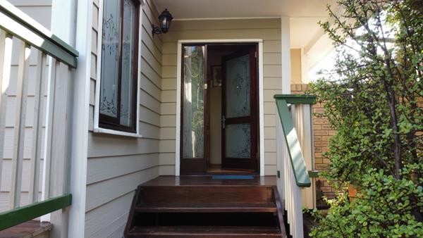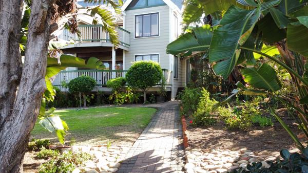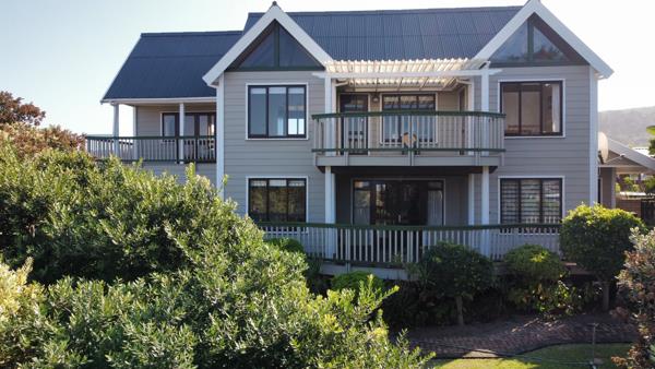 a Charming Double-story home nestled in the heart of the Garden Route, located in the sought-after coastal village of Hershamjust a short stroll from the beach. This beautifully designed residence boasts a distinctive coastal architectural style, with a light-colored exterior, striking dark trim, and a bold dark grey corrugated metal roof. Multiple balconies and white balustrades offer various vantage points to soak in the surrounding natural beauty, while a paved pathway winds through the lush, landscaped garden, filled with towering trees, palms, and vibrant shrubs, creating a tranquil, private setting. A single garage at the front of the property and a separate carport at the back offer ample covered parking and storage options.