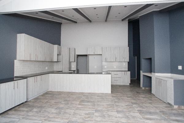 Designed with modern living in mind, the open-plan kitchen features a Defy oven with gas hob, a neatly tucked-away scullery, and flows seamlessly into the spacious living area. Elevated ceilings and a built-in braai create a warm, airy space ideal for both family time and entertaining.