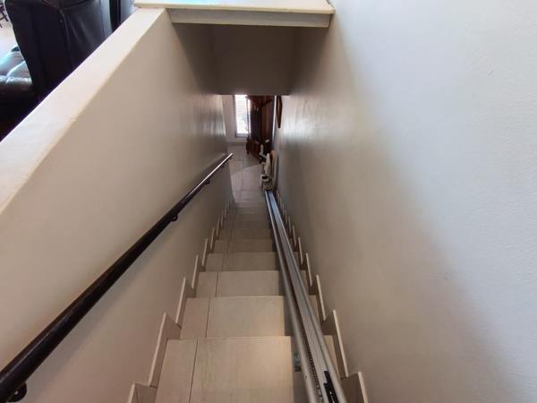 The home features an open-plan lounge and kitchen area that leads to a small balcony with a built-in braai the perfect spot to enjoy the ocean breeze. A stairlift provides easy access to the main living level if needed.