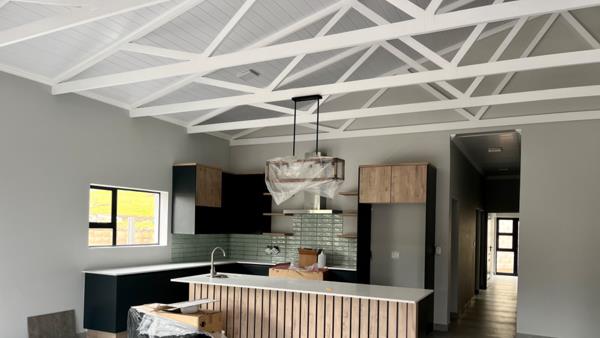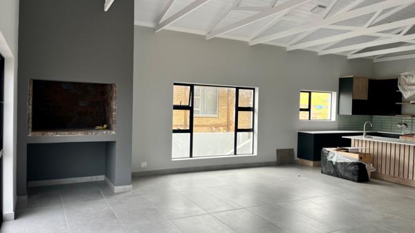 A beautiful, open plan kitchen and living areas with a built-in braai. The separate scullery/laundry with built in cupboards has access to outside.The main bedroom has an ensuite bathroom, a walk in cupboard and a door leading to a patio. Another full bathroom serves the other 2 bedrooms.