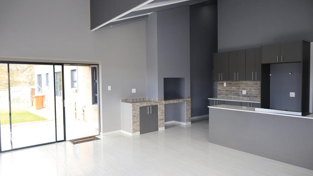 Designed with modern living in mind, the open-plan kitchen features a Defy oven with gas hob, a neatly tucked-away scullery, and flows seamlessly into the spacious living area. Elevated ceilings and a built-in braai create a warm, airy space ideal for both family time and entertaining.