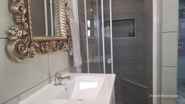 The extra length single garage host the laundry and is tiled perfectly with white built in cupboards. Three open, paved, safe car parkings in the front of the property. The 5kva inverter is neatly fitted to the wall. 9 x 450watt sun panels installed on the roof.