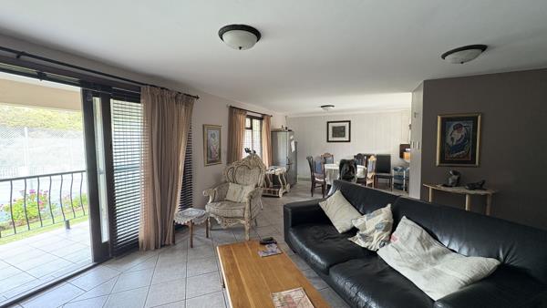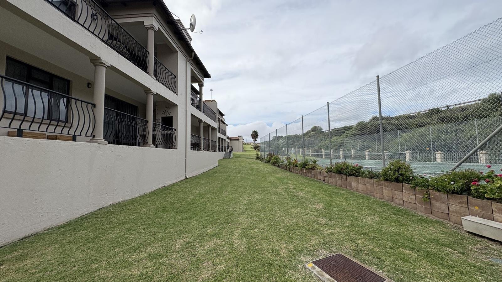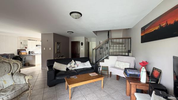 The double-storey home features a spacious open-plan living and dining area on the lower level, complemented by a well-designed kitchen with melamine countertops, a scullery, and laundry facilities. From the living space, doors open onto a covered outdoor entertainment area with a built-in braai, overlooking the complex tennis courts. A guest toilet completes the ground floor.