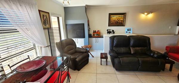 All three bedrooms have built-in cupboards, while the main bedroom offers a chic en-suite bathroom with a large walk-in shower. A second modern bathroom serves the remaining bedrooms. On the ground floor, the extra-large automated double garage includes direct home access and a professionally installed walk-in safean exceptional feature offering both convenience and security. Outside, the landscaped, low-maintenance garden is filled with indigenous plants and includes a Wendy house for additional storage.