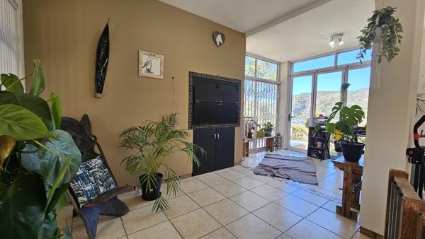 Open plan living, dining and kitchen area with a cozy fireplace in the lounge and a BONUS sunroom with built in braai opening up onto the deck.