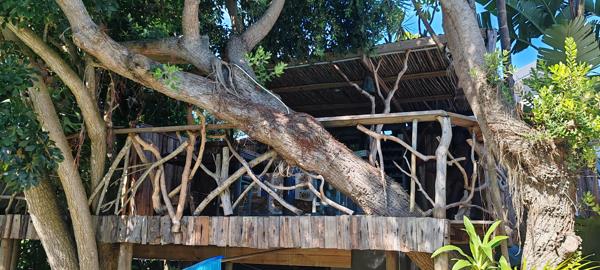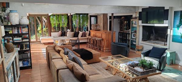 For seamless indoor-outdoor living, the home includes a built-in braai, bar, and entertainment area that opens onto the deck with stacking doors. A staircase from this area leads to a charming bush bar for an elevated social experience.