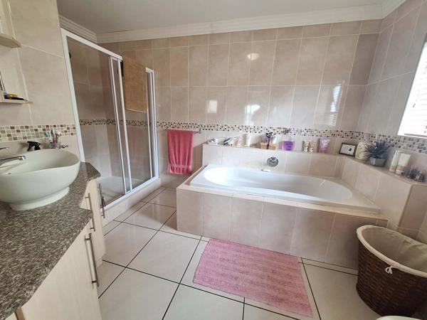 Featuring 4 bedrooms, 2 of which are double volume - main bedroom on the upper level and 3 on the lower level. This architect designed home provides ample space and privacy for families and guests. Each bedroom with built-in cupboards is a haven of comfort and relaxation. The master bedroom offers a touch of luxury with modern fixtures and has a modern full an-suite bathroom with granite tops. Two of the bedrooms on the lower level also have an-suite bathrooms. From the downstairs living area, a door leads to a large under cover paved entertainment patio, garden with Wendy hut and sparkling pool.
