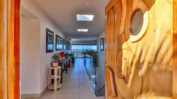 As you enter the home at street level, you are greeted by an inviting entrance hall that flows seamlessly into a spacious open-plan living room. This area is bathed in natural light, thanks to large windows that offer stunning vistas of the ocean. The modern kitchen, equipped with ample cupboard space and a large scullery, is perfect for culinary enthusiasts. An indoor braai complements the living space, making it ideal for entertaining. The living room opens onto an expansive balcony with frameless glass windows, allowing you to enjoy unobstructed views of the sea.