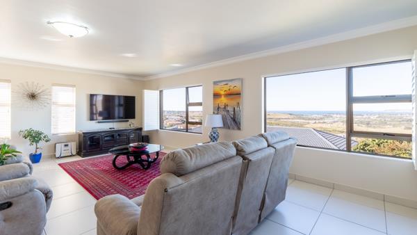 Welcoming entrance hall leads to an open-concept living areaincluding lounge, dining, kitchen with sculleryand an indoor braai room. Large sliding windows and high ceilings showcase sweeping sea views, beautifully blending interior and exterior spaces.