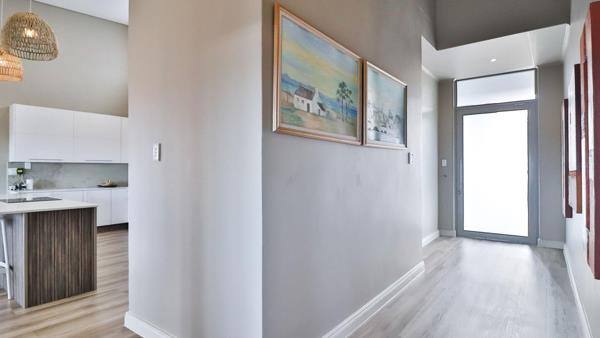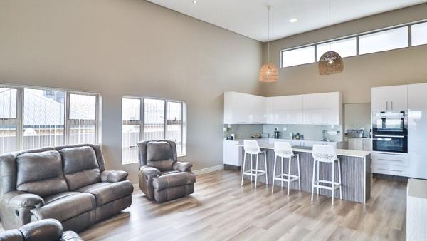 The heart of the home is its open-plan living area, seamlessly flowing into a designer kitchen featuring exquisite finishes and a separate scullery. With double-volume ceilings and skylights, the space is flooded with natural light, creating a bright and expansive atmosphere. The kitchen is equipped with a double eye-level oven and a premium stove, perfect for any culinary enthusiast. The living area opens up with stacker doors unto the patio/pool area with beautiful views.