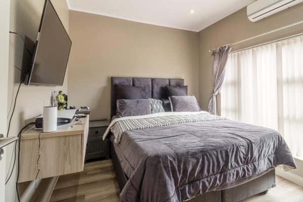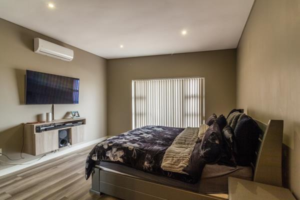 The dedicated braai and bar room, featuring a built-in stainless-steel braai, flows to a sunlit patio with a heated rimless splash pool and multi-coloured ambient lightingperfect for sophisticated entertaining or relaxed evenings under the stars.